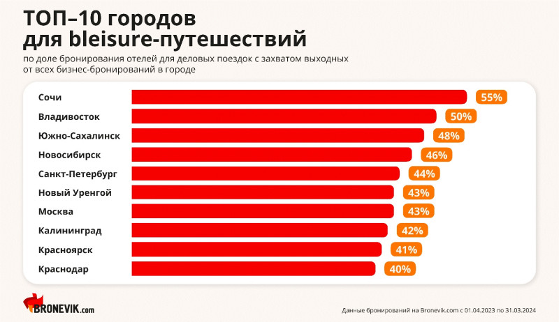 В целом за год количество командировок в России, включающих выходные дни, выросло на 19%. Отели для таких поездок бронировали в среднем за 10 дней до заезда, в то время как для сугубо деловых поездок — лишь за неделю. Средняя длительность bleisure-путешествий составила 4 ночи против 2 ночей для обычных командировок. Средний чек за бронирование жилья для командировок с мини-отпуском составил 17 400 руб., а для деловых поездок без выходных — 7 900 руб.